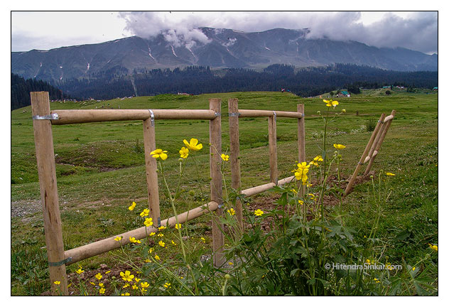 Leaning wooden fence in Gulmarg, Kashmir, India.