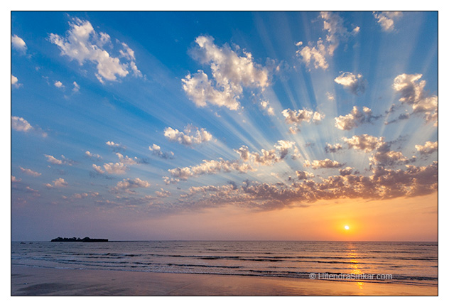 Beautiful Sun rays scattered through clouds. Sunset at my home town Alibag. A famous landmark of Alibag the Kulaba fort is also visible on left.